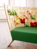 The result was oversized cross-stitch ornaments in knitted wool and a braided birch wood construction for the couch and the lounge chair, which together created "The X-Me Collection".